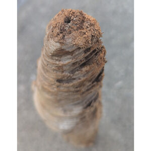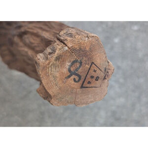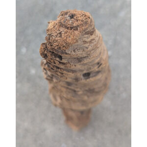 Shows wear, there are some spots, wood cracks, big chip at the bottom and some damage at the top. Measures approximately 13.5" tall.
