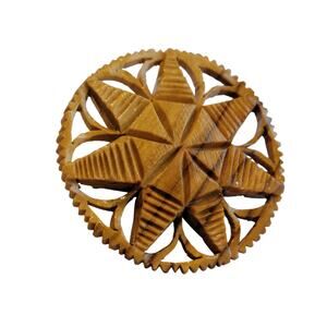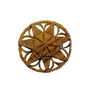 Hand Carved Wood Star Pin Brooch 1.5" Round Folk Art Geometric Design Vintage