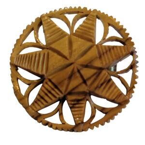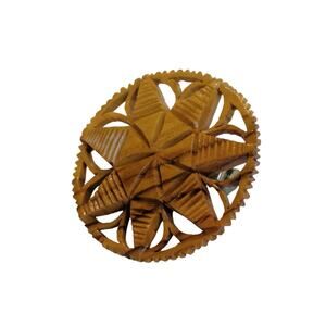 Vintage round brooch with hand-carved wood star and geometric pattern. Measures approx. 1.54". Lightweight and unique piece of folk art jewelry with metal pin clasp.