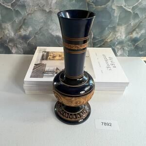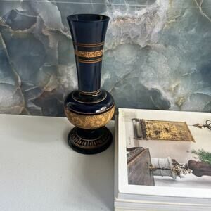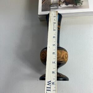 This unbranded hand-carved wood vase features a beautiful floral design, making it a decorative piece for any room in your home. Standing at 8.5 inches tall, this handmade item from the 1970s showcases intricate carvings and a painted black and brown finish, adding a unique touch to your space. Perfect for those who appreciate traditional craftsmanship and vintage aesthetics, this vase brings a sense of artistry and character to your living environment.