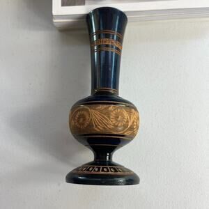 Hand Carved Wood Vase 8.5" Floral Design Decorative Black Brown