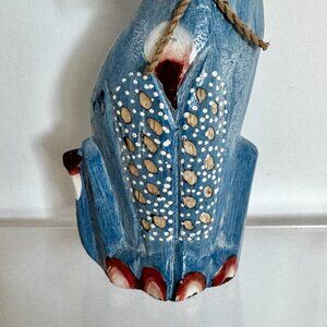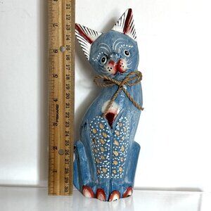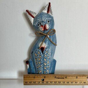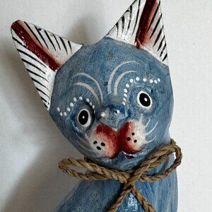 Hand Carved Wooden Cat Figurine Handpainted Blue Colorful Home Decor