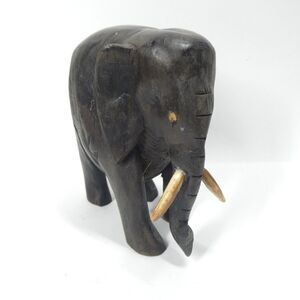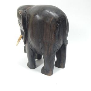 Vintage carved wood elephant figurine. Measures about 4.75 inches tall. Age and origins unknown. Some minor surface wear such as scuffs and scratches, but still displays well.