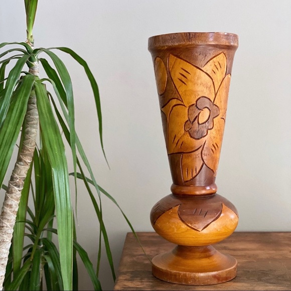 Hand Carved Wooden Vase, Decorative Wood Vase Handmade Vintage Home Decor