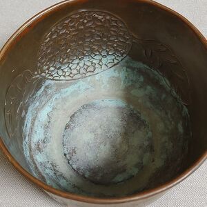Hand Carved and Hand Painted Round Brass Cache Pot. Perfectly distressed paint and patina on this bowl that can be used as decor, for plants or for storage.