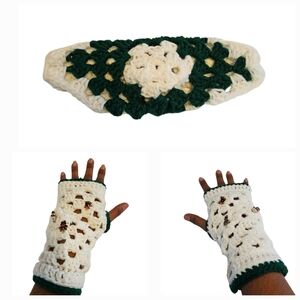 Hand Crafted 3pc Set Fingerless gloves headband white granny square Retro gloves