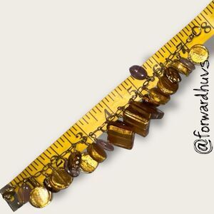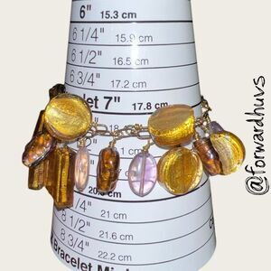This handcrafted artisan bracelet features a rich blend of genuine amethyst beads and foil-core leaf shaped glass elements with a subtle purple shimmer finish. The textured glass beads reflect light with layered violet tones, resembling Murano-style craftsmanship. Complementing the shimmer are gold-glass circles, and rectangular glass squares, all wire-linked along a non-precious metal chain.