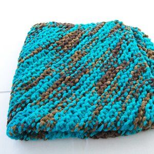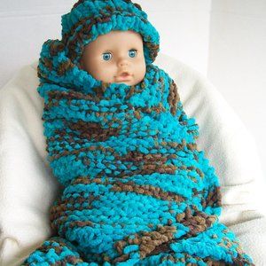 Hand Crafted Baby Blanket Hat Set Turquoise Blue Brown Chunky Swaddle