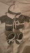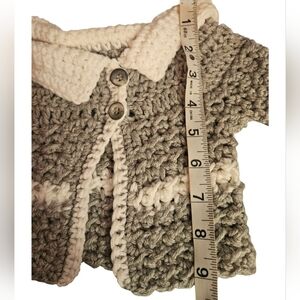 Hand Crafted Handmade 100% acrylic color gray and white set of 3- pieces sweater open cardigan with 2 gray acrylic buttons in chest, small baby pompom Beanie hat and baby crocheted booties shoes