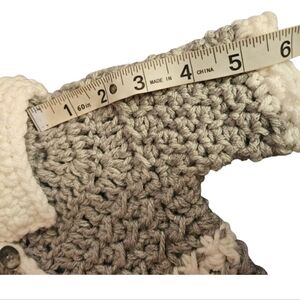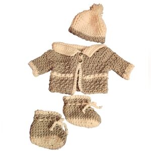 Hand Crafted Baby Sweater Hand Knit Crochet White Gray Botties Pom pom Hat 3-set