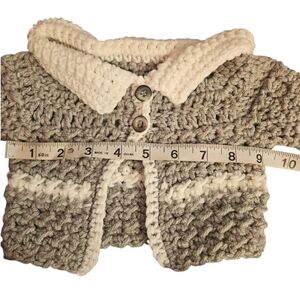The sweater has a double stitch chuncky style knitting stitch. The hat is soft and extretchable. Recommend for Newborn to 6 months. 2" x 2" handmade pom pom on top of the crochet hat. The foldable collar is white as the trim and long sleeves a white stripe on the waist