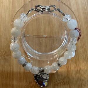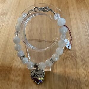This listing is for a gorgeous handcrafted beaded bracelet for mom. It is made with white quartz beads with a MOM metal charm/pendant. It closes with a rhinestone loop clasp.