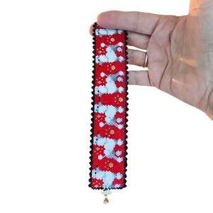 These fancy white poodles are groomed and ready to grace your wrist with ribbons in their hair and lots of style and pizzazz! This bracelet was sewn using a peyote stitch technique with embellishment on the sides and is finished with a CZ embellished magnetic closure. The price tag reflects the amount of labor that went into this bracelet, about eight or nine hours of labor. Do be sure to check out the video to see all the sparkle and twinkle that this bracelet has to offer. The bracelet measures approximately 7 1/2 inches long and about one and a half inches wide.