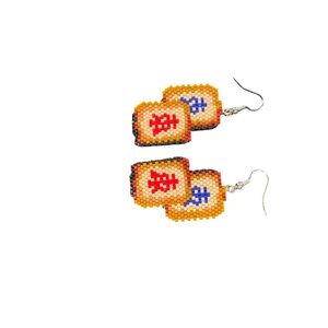 These fun handcrafted beaded Mah Jong earrings showcase tiles from the popular card game. Drop length is 2.3 inches. Perfect for those who appreciate unique, high-quality craftsmanship, this piece is a testament to whimsical artistry.