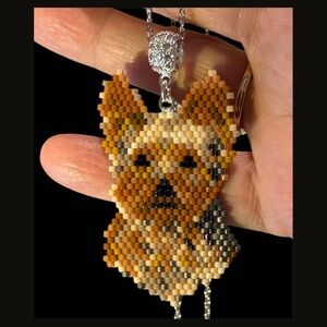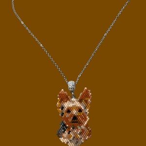 This handcrafted beaded pendant showcases a portrait of a Yorkshire Terrier “Yorkie” dog with a solemn sweet expression on its face.