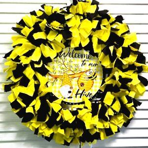 Hand Crafted Black & Yellow Fabric Rag Wreath, Welcome To Our Hive Wreath 18"