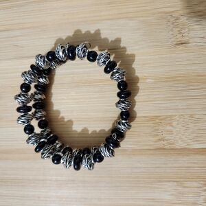 Hand Crafted Bracelet Coil Black and Silver Beaded Fits Most Memory Wire