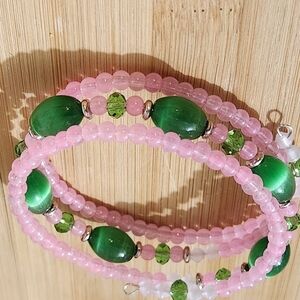 Hand Crafted Bracelet Memory Wire Coil Pink and Green Beaded Medium Size