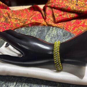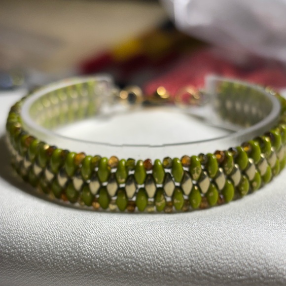 This elegant handmade bracelet features olive green and gold tone SuperDuo beads and genuine ombré tourmaline rondelle crystals with gold tone clasp. 8 inches for snug fit or for a dangle look. Compliment your formal or casual wardrobe this summer with this beautiful accessory. Artisan made by Gina’s Beadiful Accessories