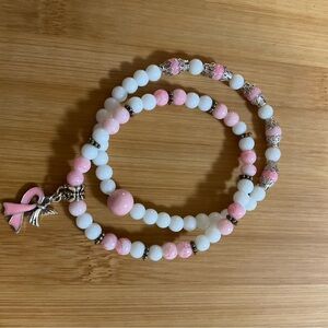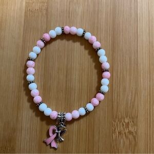 This is a 2 piece handcrafted breast cancer awareness bracelet set. There are 2 stretch bracelets in the set. The beads are pink and white with silver accents. One of the bracelets has an angel charm.