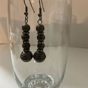These handcrafted earrings showcase a striking vertical design with a series of brown beads, each adorned with intricate antiqued metal caps. The alternating bead sizes create a captivating visual effect, while the simple metal fish hook ear wires add a touch of elegance. Perfect for adding a gothic flair to any ensemble.