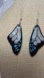 Beautiful lightweight resin earrings are in the shape of butterfly wings. No butterflies were harmed to make these earrings! Beautiful see through metallic silver with vibrant blue dots are outlined in black. The wing measures a little over 2" and hang from pierced .925 sterling silver French ear wires. Total measurement is 3".