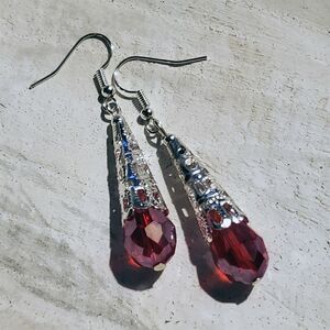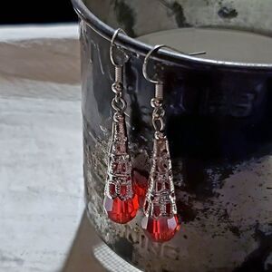 Hand Crafted Caged Filigree Faceted Red Crystal Silver Teardrop Earrings