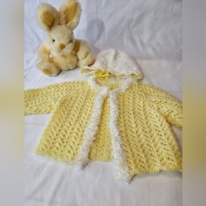 Hand Crafted Handmade 100% acrylic color yellow and white set of 2- pieces sweater open cardigan and baby hat bonnet style.