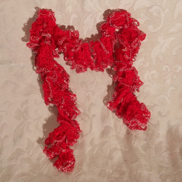 This is a brand new hand crocheted ruffle scarf in cherry red with silver accent, scarf is 42 inches long and really pretty, acrylic yarn A0037