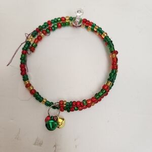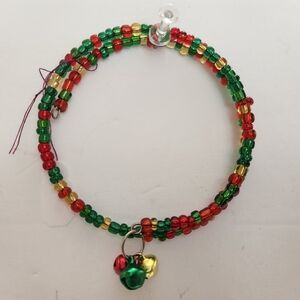 This listing is for a handmade Christmas wrap bracelet. It is made out of red, green, and gold seed beads with a cluster of Christmas jingle bells as a charm. The bells are metal in the colors of gold, red, and green.