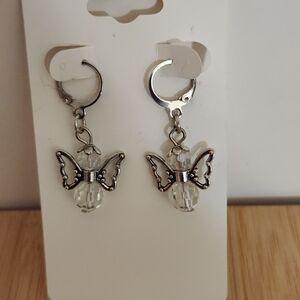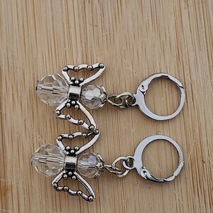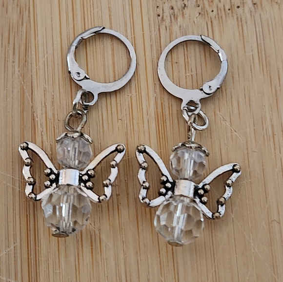 Elegant angel earrings with silver findings. Features clear crystal beads, silver wings, and silver halo and stainless steel lever earwires.