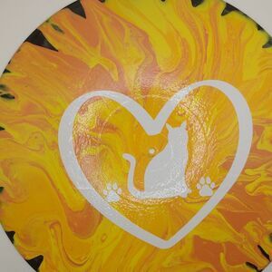 * The subject of this item is a cat in a heart with paw prints