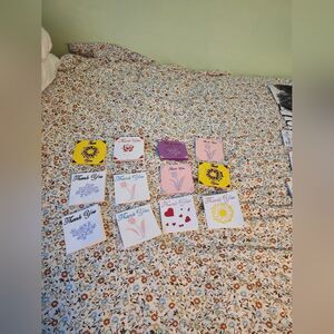 Set of thank you cards with floral and heart designs. Features vibrant colors and patterns. Beautiful cards to say thank you. Features 'Thank You' message. Perfect for expressing appreciation. You get 12 card, and they are handmade. These beautiful hand-made cards have a variety of designs. The inside is blank for you to put in your own sentiment. They are made with premium card stock. They are multi-colored. White envelopes included.