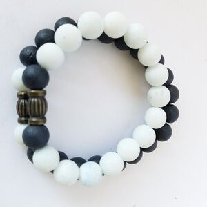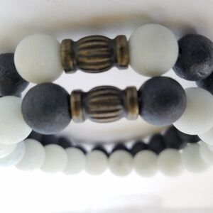 The bracelets are made of 12mm matte stone navy and white beads with a bronze-like connector. They are strung on a strong elastic cord. The navy/white bracelet is 7.5". The white/navy bracelet is 6.5". The navy beads are almost black.