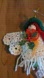 Hand Crafted. Crochet hand knit dolly made into Angels's wings handpainted wooden face with red yarn hair, hand knit crochet green holiday beanie hat, and upcycled multicolor plastic beads color in beads are green, clear, red, lavander  and pink.