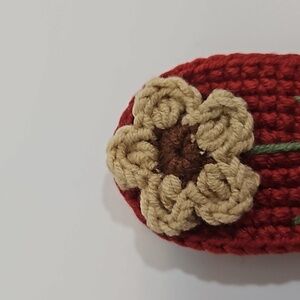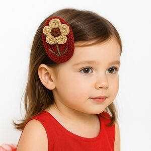 Hand crafted and hand-knit with care, it features a 2.5" silver snap clip backed with soft white felt to protect hair. The crochet flower in red, beige, and dark brown is accented with a hand-embroidered green stem and leaves – adding a romantic, botanical touch.