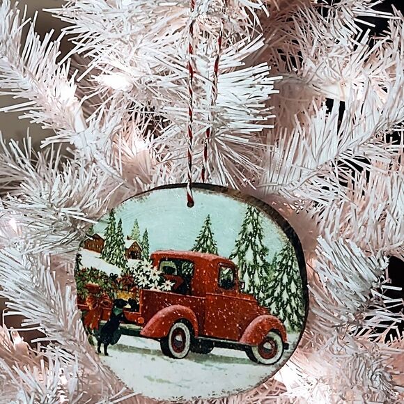 Handmade Christmas ornament, Christmas gift, Christmas tree decor, Christmas decoupage, wood Christmas decor, gift basket filler, farmhouse Christmas, vintage truck, black lab.