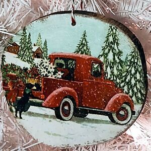 Hand Crafted Decoupage Wooden Christmas Ornament/Vintage Red Truck w/ Puppies