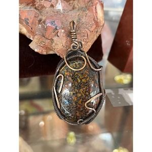 This dinosaur bone pendant was a fun one! I used bare copper weaving wire, and bare copper square wire for the frame around this polished dinosaur bone cabachon. The added character on this pendant is the weaving down the sides of the frame. I flattened pieces of square copper wire and utilized the flat pieces into the frame itself. This is one that i am very proud of! I then oxidized and polished this pendant to give it an old and antiqued look. This would be a great gift for friends and loved ones!
