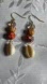 Hand Crafted Unique Boho dangle cowrie shell earrings adorned with colorful Indian clay beads and glass pumpkin beads featuring a vibrant autumn orange and yellow and red and cream and gold color combination. 2.5 inches in length. Artisan made by Gina’s Beadiful Accessories