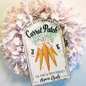 Hand Crafted Easter Fabric Rag Wreath, Pink & Purple, Carrot Patch Sign, 18"