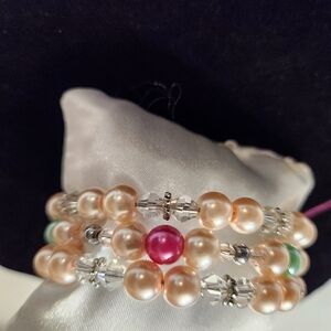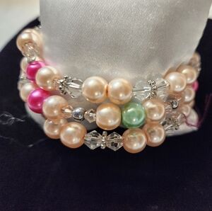 Hand Crafted Elegant Pearl and Crystal Wrap Memory Wire Bracelet Pink Green