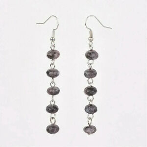Handcrafted Faceted Labradorite Gemstone Beads Long Dangle EarringsNatural semiprecious gemstone beads are hand faceted in IndiaGenuine stones will vary in color and detailing from stone to stoneBeads measure about 8mm in diameterSilver color platinum plated brass findings and earring hooksMeasures about 80mm (over 3") long overall