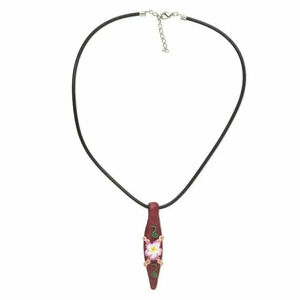 Handcrafted Fancy Clay Flower Accent Tapered Pendant NecklacePendant measures 70mm high x 18mm wide on averageEach pendant varies just a bit as they are all handmadeNeclace cord made with black rubber with lobster claw claspNecklace measures 16" long with 2" extender chain