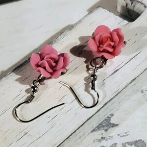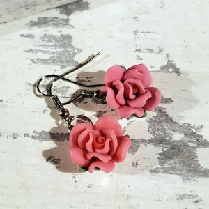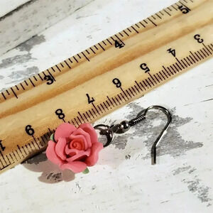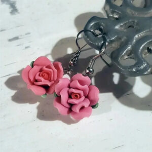 Hand Crafted Fimo Polymer Clay Pink Rose Flower Bead Dangle Earrings
