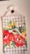 Colorful floral patterns on a gray and white checkered background with a white crocheted top and brown button closure Perfect anytime hostess bridal shower or new home gift