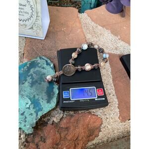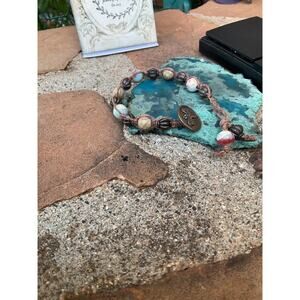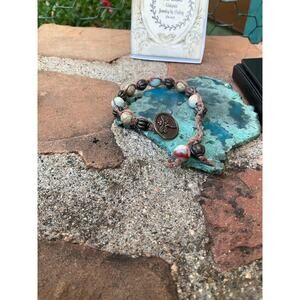 This hand beaded bracelet features snakeskin jasper stone beads from Australia, imperial jasper. The macrame is knotted using an earth tone light brown hemp to compliment the shabby chic colors of these jasper stone beads. The copper spacer beads might make your think of pumpkins. They are pewter based copper with beautiful engraved lines. The button has an etched dragongly design. This macrame bracelet would make an amazing handmade jewelry gift for friends and loved ones. It is perfect for every day use.
