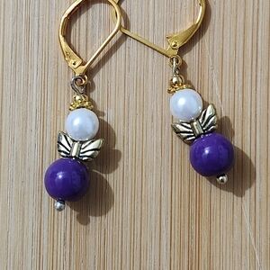 Elegant earrings with purple beads and gold accents. Features white pearls and angel wings details. Lever ear wires