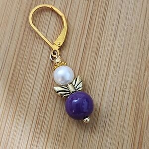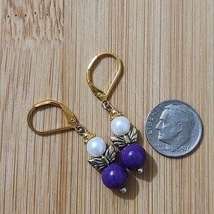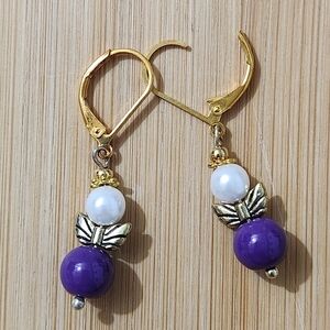 Elegant earrings with purple beads and gold accents. Features white pearls and angel wings details. Lever ear wires