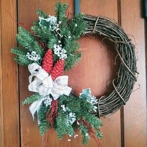 Hand Crafted Grapevine Christmas Wreath, Greenery, Ribbon and Ornaments 18"
